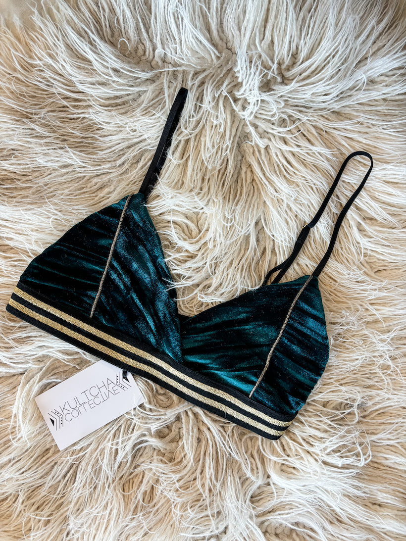 Our 'Atlanta Bralette' in crinkle velvet with gold piping feature is PERFECT for outerwear or under garment.