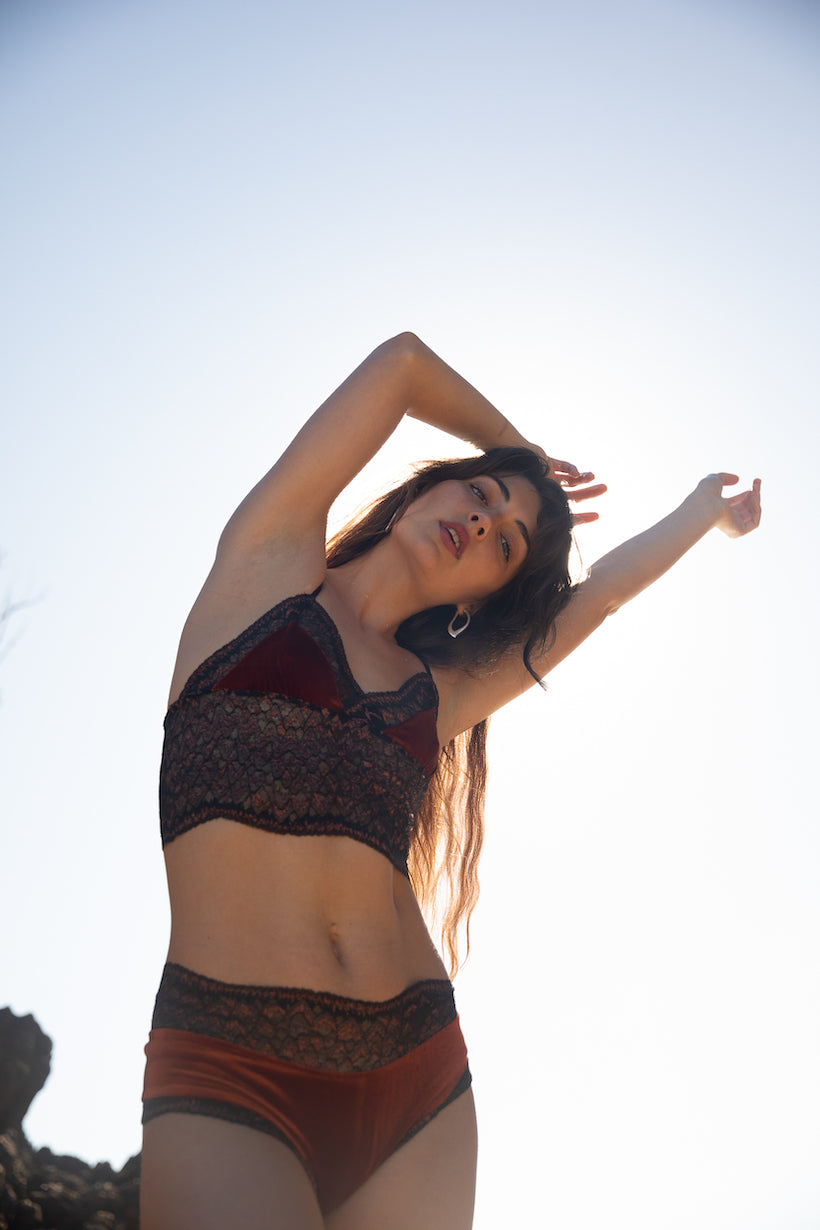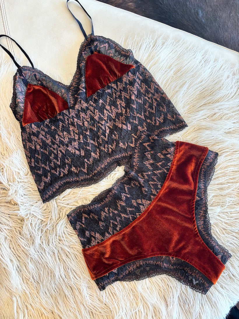 Rust/Orange velvet, paired with this stunning glitter rust and black lace.